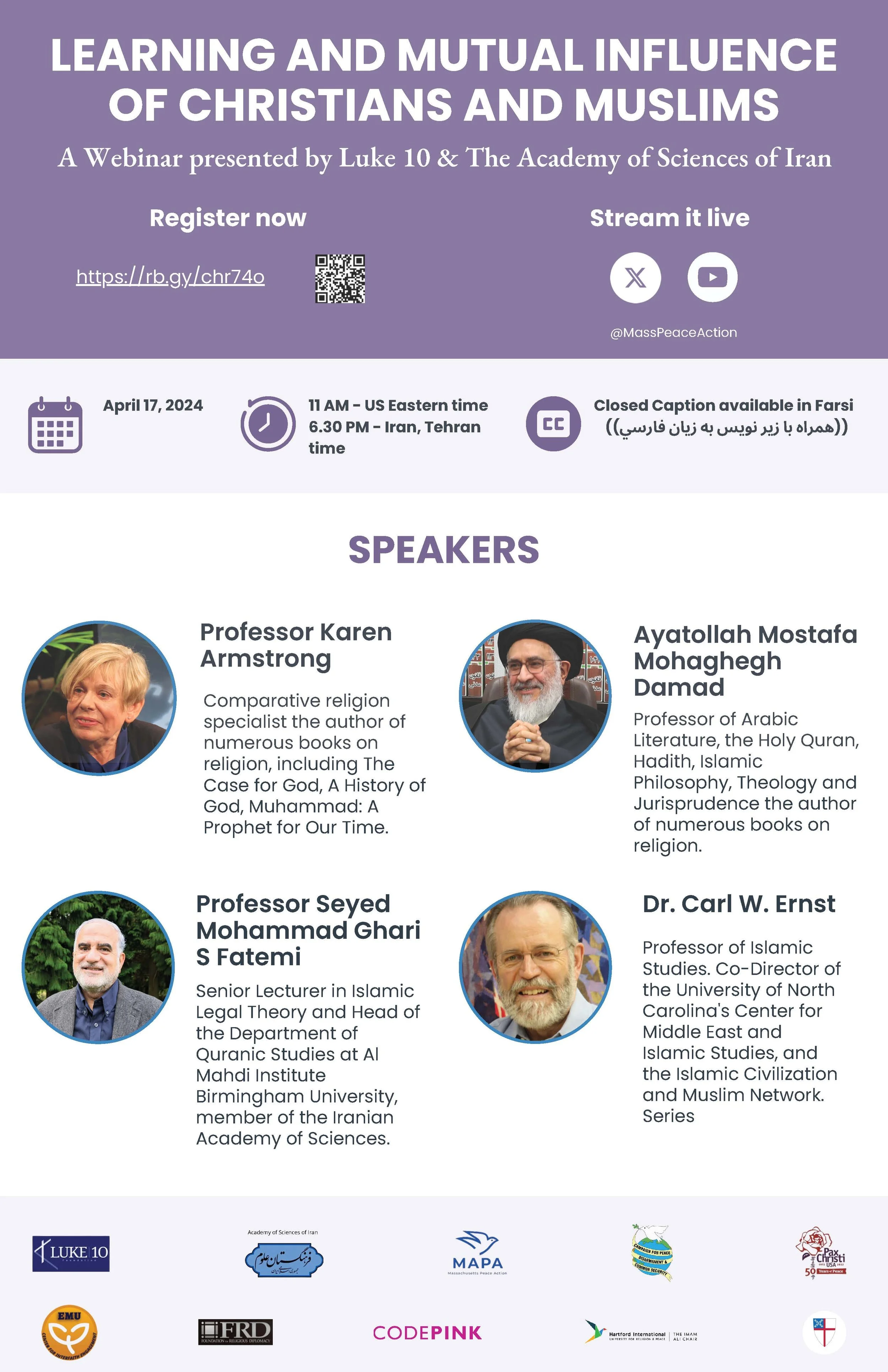 Learning and Mutual Influence of Christians and Muslims This is a recording of the special interfaith webinar held on April 17, 2024. Transcripts Introduction by the Right Reverend John Bryson Chane, 8th Bishop of Washington DC The Relationship between Islam and Christianity by Seyed Mostafa and Ayatollah Mostafa Mohaghegh Damad Dr. Carl W. Ernst on Contemporary Aspects Muslim - Christian Interactions by Professor Seyed Mohammad Ghari S. Fatemi Webinar flier